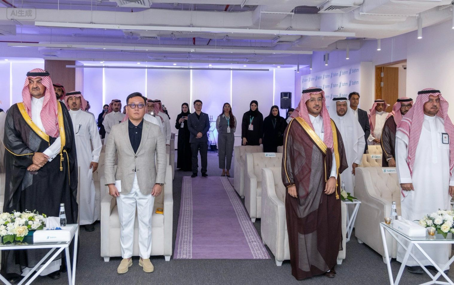 وصف الصورة: الصف الأول، من اليسار: صاحب السمو الملكي الأمير خالد بن سعود الفيصل، والسيد ستيفن تشو رئيس مجلس إدارة شركة سهم كابيتال،و د. سعد الحربي‏ – ‏وكيل وزارة التعليم لتنمية قدرات الطلاب ، خلال عزف السلام الملكي السعودي.