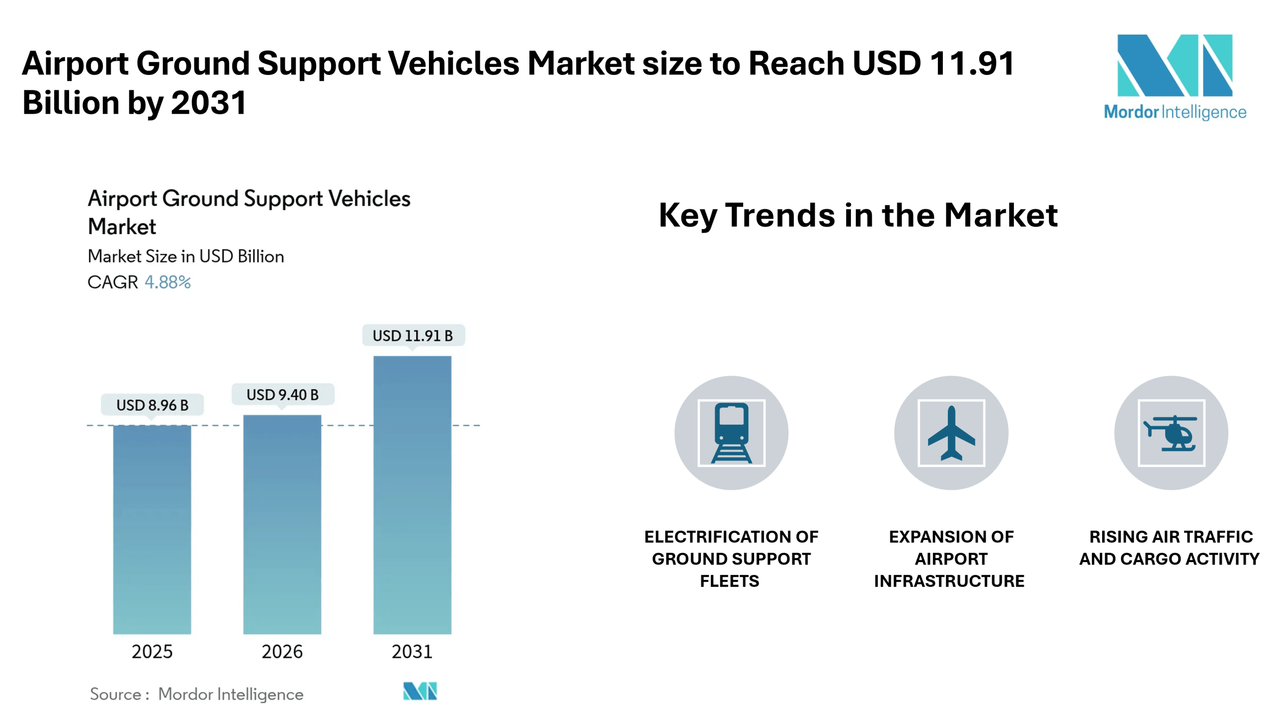 According to Mordor Intelligence, the airport ground support vehicles market size was valued at USD 9.40 billion in 2026 to reach USD 11.91 billion by 2031, reflecting steady expansion during the forecast period. The airport ground support vehicles market forecast highlights consistent demand driven by airport expansion projects, fleet modernization, and the transition toward electric-powered ground handling equipment.