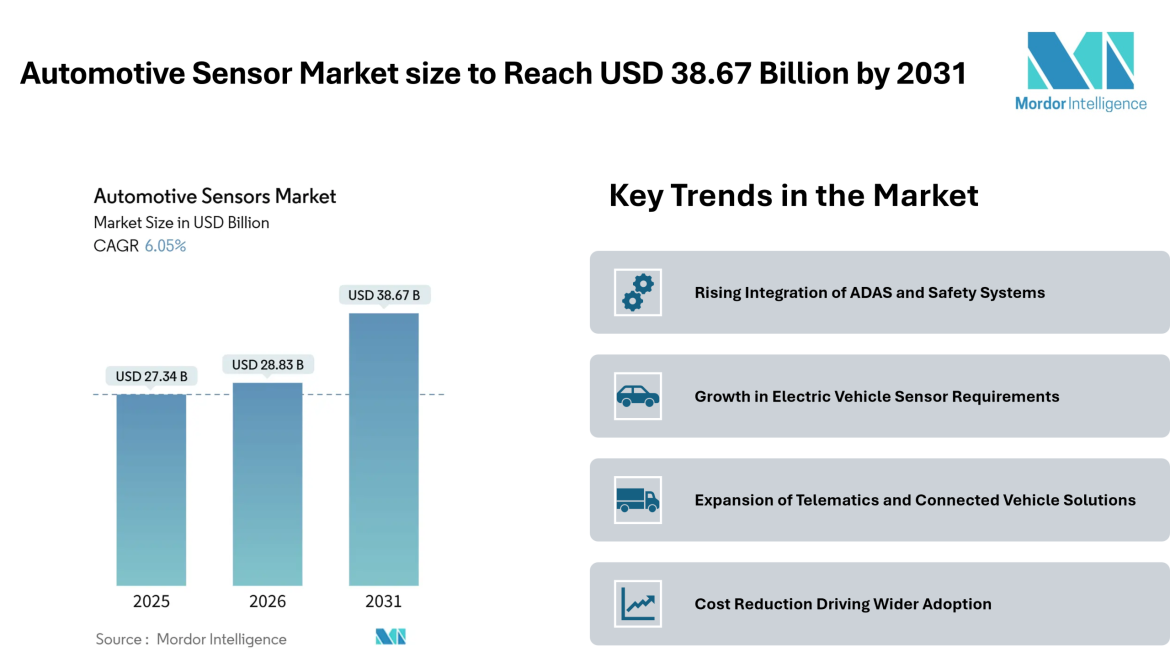 According to Mordor Intelligence, the automotive sensor market size was valued at USD 27.34 billion in 2025 and is estimated to grow to USD 28.83 billion in 2026, reaching USD 38.67 billion by 2031, registering a CAGR of 6.05% during the forecast period. This steady automotive sensor market growth reflects the increasing integration of sensors across modern vehicles, where safety, efficiency, and connectivity are becoming standard expectations rather than premium features.