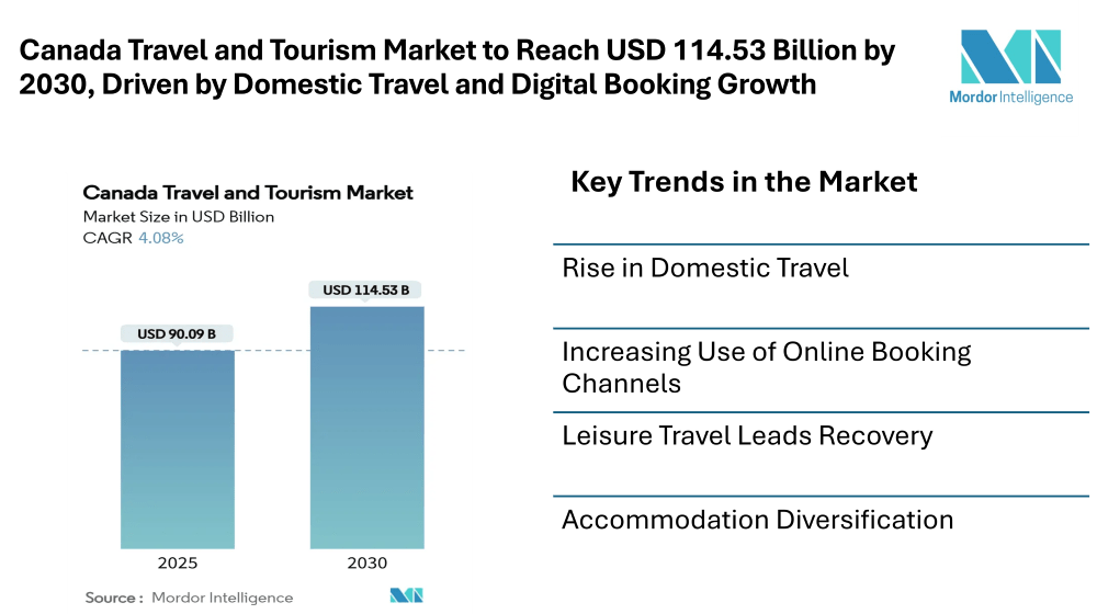 The Canada Travel and Tourism Market is valued at USD 90.09 billion in 2025 and is projected to reach USD 114.53 billion by 2030, growing at a steady CAGR of 4.08% over the forecast period, according to the Canada Travel and Tourism Market report. The market continues to benefit from a stable rise in domestic travel, increasing inbound tourism, and a strong recovery in leisure and hospitality services.