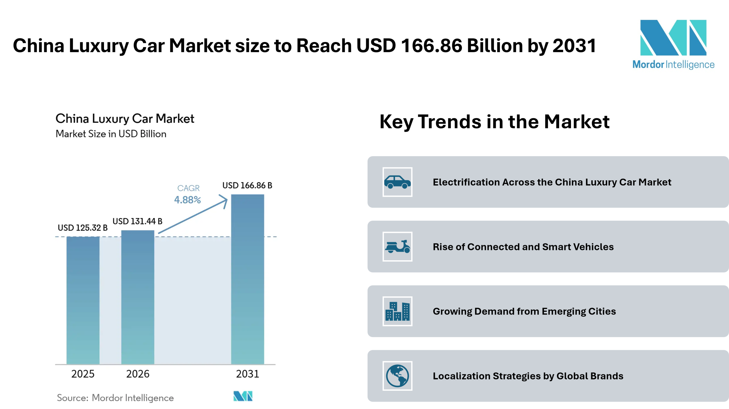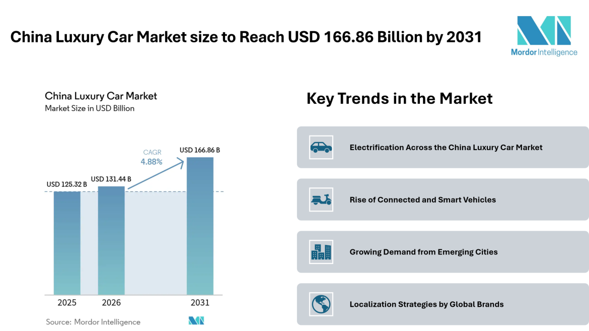 According to Mordor Intelligence, the China luxury car market size is expected to grow from USD 125.32 billion in 2025 to USD 131.44 billion in 2026, and further reach USD 166.86 billion by 2031, registering a CAGR of 4.88% during the forecast period.