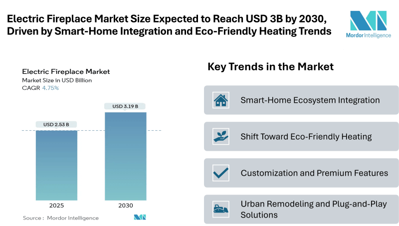 Electric Fireplace Market Size Expected to Reach USD 3.19 Billion by 2030, Driven by Smart-Home Integration and Eco-Friendly Heating Trends