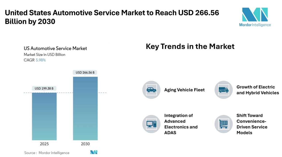 The United States automotive service market is on track to grow from an estimated USD 199.38 billion in 2025 to approximately USD 266.56 billion by the year 2030 translating into a 5.98% CAGR. This expansion will stem from a combination of factors including an aging vehicle fleet, increased vehicle usage, and rising complexity in service requirements. As the United States automotive service market size expands, stakeholders across the sector repair workshops, parts suppliers, service networks and technology providers will find increasing opportunities to capture share. An understanding of the United States automotive service market share, united states automotive service market analysis, and united states automotive service market trends is essential for players seeking to position themselves ahead of change.
