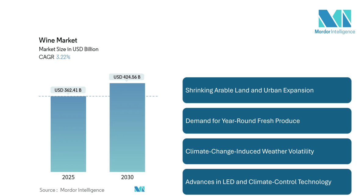 The global wine market, valued at USD 362 billion in 2025 and projected to reach USD 425 billion by 2030 with a CAGR of 3.22%, is set to maintain steady growth, reaching new heights by 2030. Increasing demand for premium, flavored, and fortified wines is driving this expansion. While the COVID-19 pandemic affected on-trade wine consumption, home consumption grew in regions like North America and Europe. As restaurants and bars reopen, the market is expanding by catering to changing consumer tastes, convenience, and quality preferences.