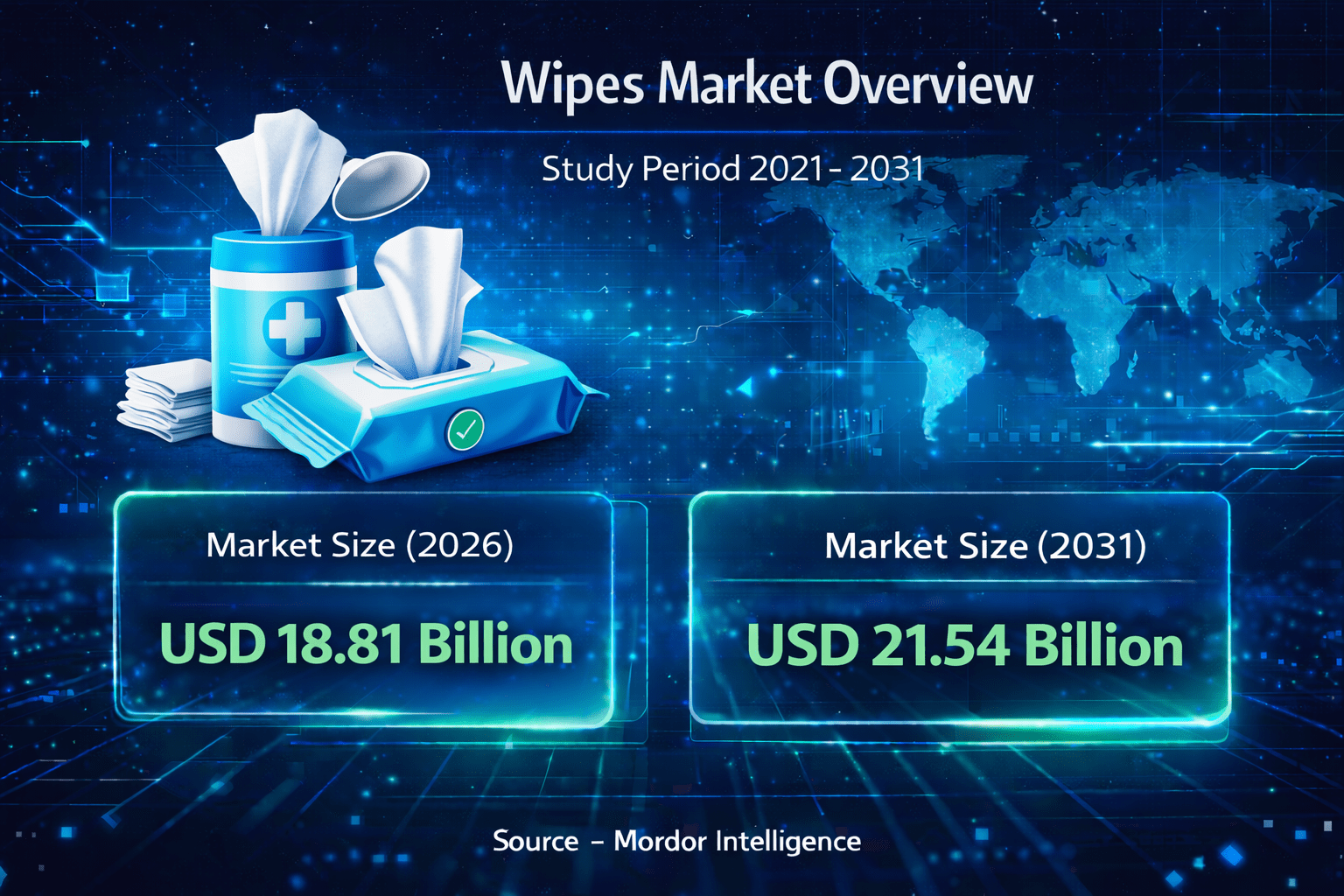 The global wipes market size was valued at USD 18.81 billion in 2026 and is projected to reach USD 21.54 billion by 2031, reflecting steady expansion during the forecast period. The consistent rise in hygiene awareness, evolving consumer lifestyles, and growing adoption of ready-to-use cleaning solutions are strengthening overall wipes market growth.